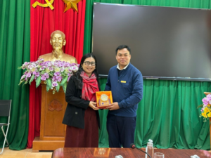 TS. Lê Phương Hòa (Phó Viện trưởng Viện Nghiên cứu Châu Á – Thái Bình Dương) trao quà kỷ niệm cho Ông Ngân Phúc Hậu (Phó Chủ tịch UBND xã Na Mèo)